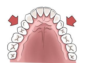 舌が上顎の歯列に収まっていないと、頬が外側から歯を押す力に対して、内側から歯を押し広げる力がないので、図のような歪んだ顎の骨と歯並びになります。
